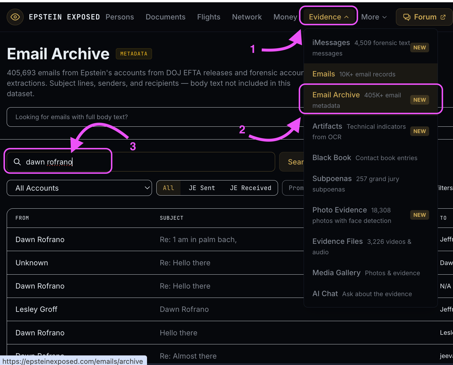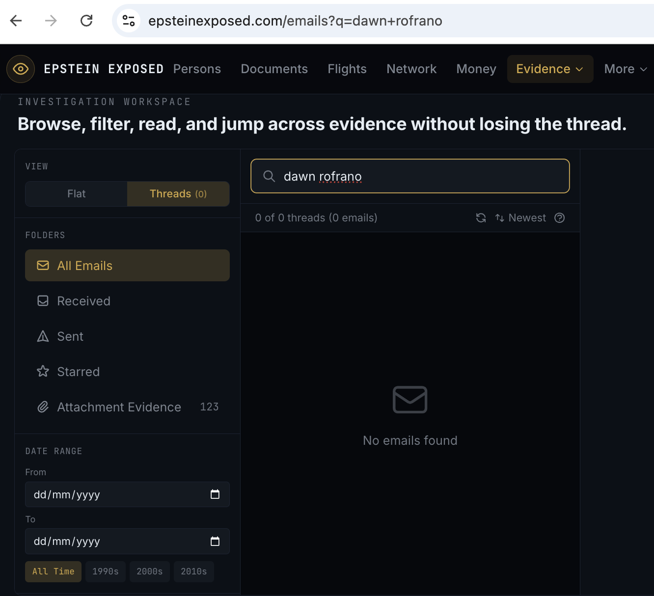 Evidence > Email Archive (was 405K, now 1.78M as of today): Metadata-only records from the jmail.world dataset — sender, subject, recipients, date, but no body text. This is the section where you found Dawn Rofrano.