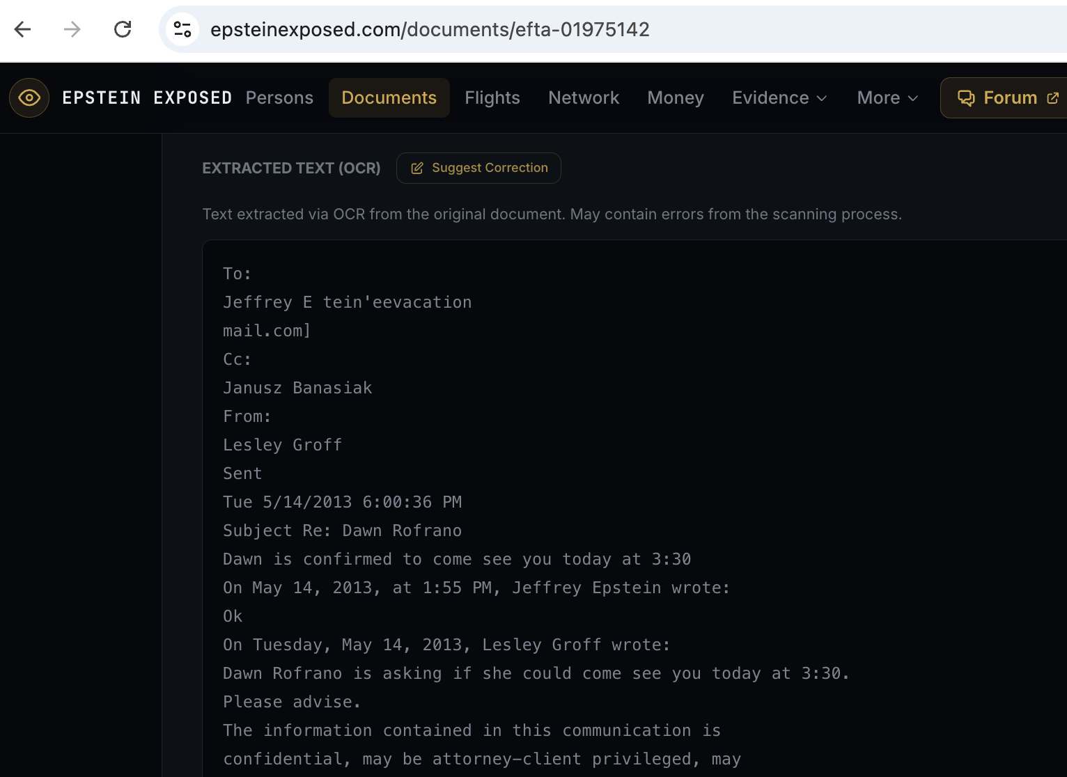 @EpsteinExposedAdmin - Eric, what’s the difference between the Evidence > Emails and Evidence > Email Archive sections? Why would an email appear in Documents but not in Evidence > Emails at all, but appears in Evidence > Email Archive as a metadata stub (e.g. EFTA01975142)?