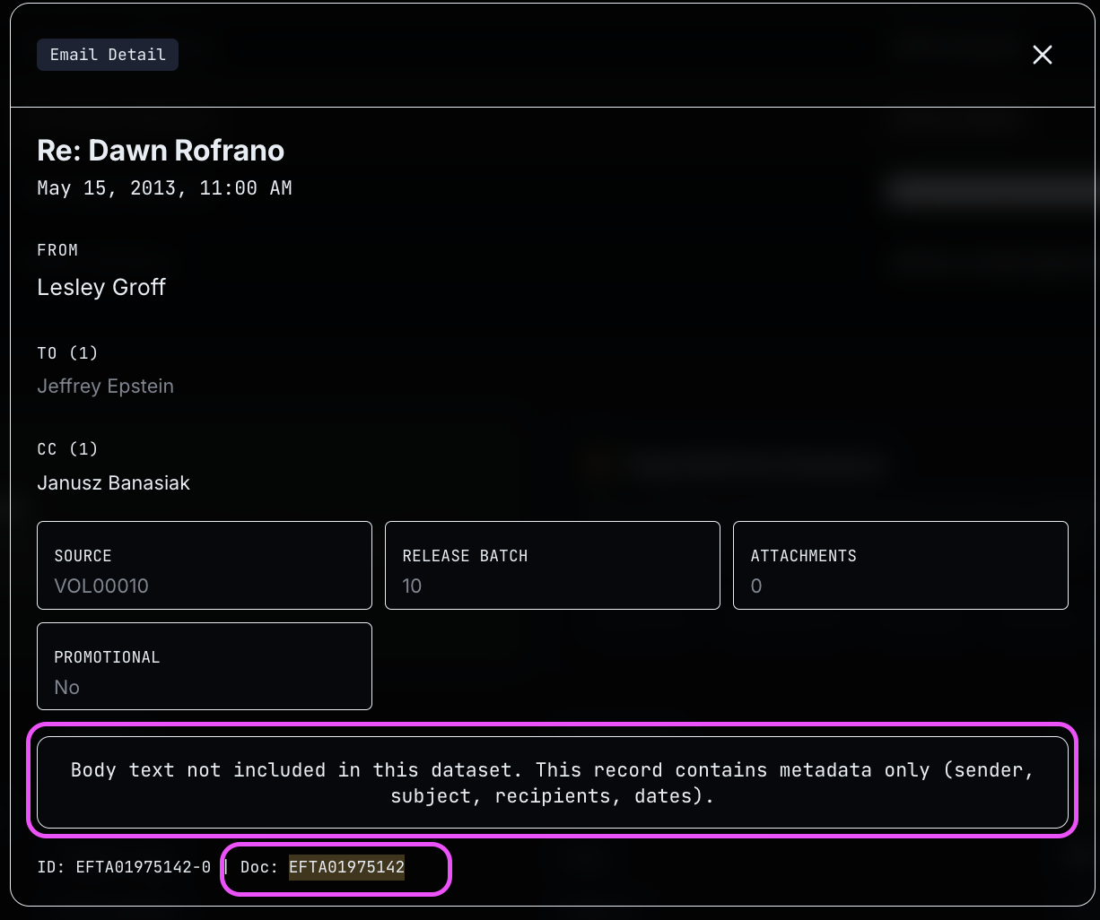 We were only ingesting ~23% of the available jmail metadata (batches 9 and 11 were completely missing — that’s 1.3M emails). We’ve just completed a bulk ingest of all 1,783,792 email records — 1.38M new emails added to the Email Archive. All of Dawn Rofrano’s 134 emails across batches 1, 9, 10, and 11 are now searchable.